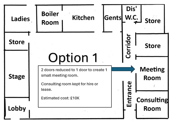 We have now received confirmation from Swallowfield Medical Practice that the G.P. Surgery will not be returning to the hall. Therefore, we are exploring possible alternative uses for the rooms at the rear of the hall. We have identified some possible reconfigurations shown below. We do not HAVE to change the room lay-out, but it is something we are considering. Shown below are 3 possible changes to the hall which we would like feedback on. Feedback forms are available in the hall, or HERE for download. Put your completed forms in the mail box at the hall, or email your comments to chair@arborfieldvillagehall.org.uk